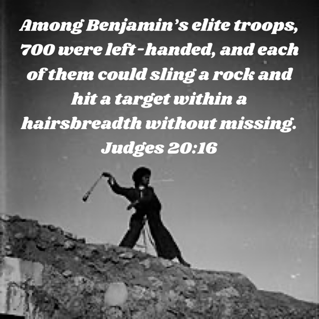 “Among Benjamin’s elite troops, 700 were left-handed, and each of them could sling a rock and hit a target within a hairsbreadth without missing.”